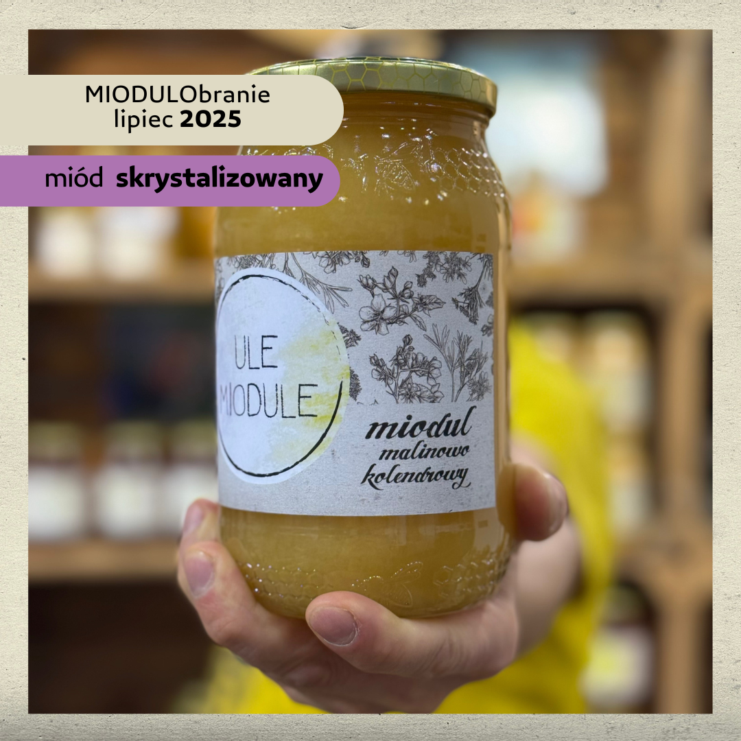 Miodul malinowo kolendrowy jest w postaci skrystalizowanej. Jest mięciutki, przyjemny do dozowania. Kolor masełkowo-złoty.